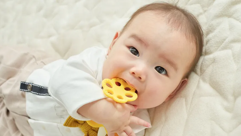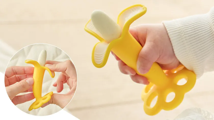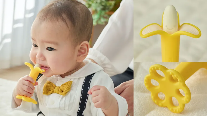 歯が生えはじめる頃の赤ちゃんの歯ぐきのムズムズの解消や、カミカミすることであごの発達を助ける役割がある歯がため。そんな歯がためを一生懸命カミカミしている赤ちゃんの姿を、より印象的に残したいという想いから「まるで本物のバナナ!?」を食べているかのような見た目でSNS映えも間違いなしのデザインにアップデートしました。もちろん、安心してお使いいただける形状や、赤ちゃんのお口に刺激を与える工夫にもこだわっています。