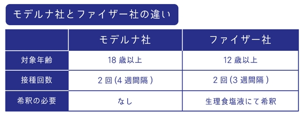また、接種間隔がモデルナ社製は4週間、ファイザー社製は3週間と異なり、ワクチンの希釈の有無も異なるため、混乱や間違いがないようにファイザー社製ワクチンを接種している会場での職域接種は不可となっています。