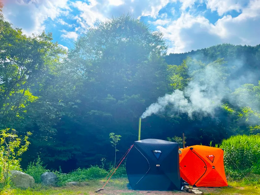 栗巣川沿いに設置した高温・低温のサウナ。薪ストーブで身体の芯から温まることができる