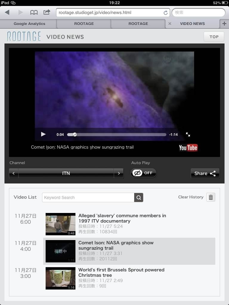 BIGLOBEがタブレット向け情報配信サイト「ROOTAGE」で YouTube上のニュース動画視聴機能を提供開始 ~テレビのような手軽さで、27メディアのチャンネル切り替えが可能~