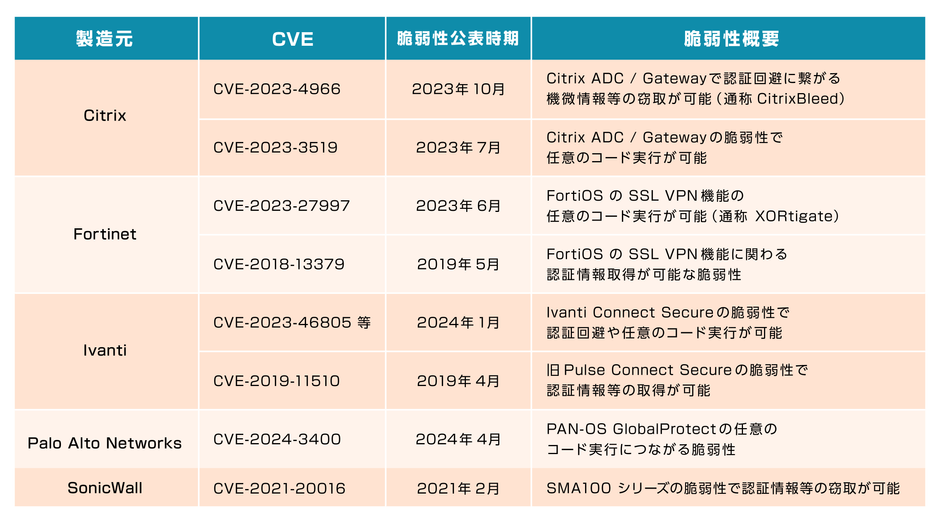 *3: Fortinet、Palo Alto、Ivanti、Check Point、Cisco、SonicWall、Citrix、Watch Guard、SOPHOS等のグローバルシェアの高い主要な製品の脆弱性特定に対応済み