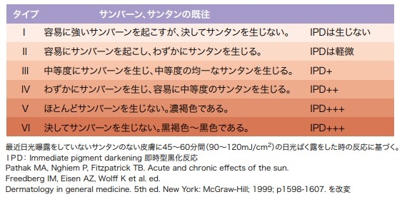 下記の図では、白人はⅠ~Ⅱタイプで、紫外線を浴びると簡単に赤くなりますが有色人種のように黒くなることは少ないとされています。日本人はⅡ~Ⅳくらいと言われており、人によって黒くなりやすい人となりにくい人がいるのはこのためです。黒人はⅤ〜Ⅵタイプでメラニン色素が多く、紫外線への抵抗があるためサンバーンやサンタンを生じることはありません。