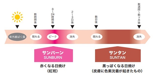 まず、紫外線が皮膚に当たると、サンバーンという赤い日焼けになります。その後メラニン色素がたくさん作られ色素沈着し、小麦色の日焼けであるサンタンになり、最終的に数週間から数か月かけ、元の色に戻っていきます。
