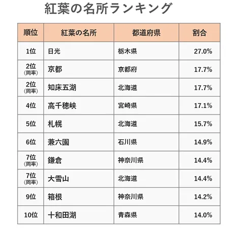 紅葉の名所の1位に輝いたのは、「日光(栃木県)」(27.0%)です。2位以下を大きく引き離し、3割近くの人に選ばれる結果となりました。同率2位には、「京都(京都府)」「知床五湖(北海道)」(ともに17.7%)がランクインしています。