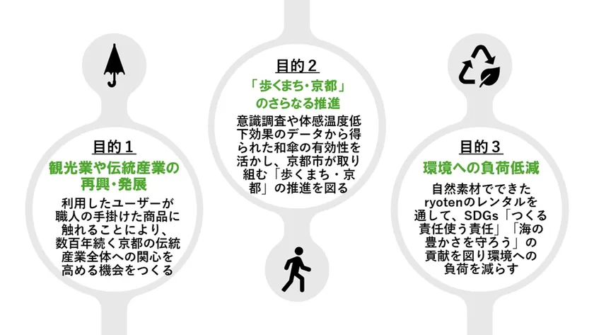和傘は、その美しさから海外観光客を含む多くの人々に「アート」として認知されています。今回のレンタルに用いられる「ryoten」は、京和傘の老舗「日吉屋」が13年をかけて開発した晴雨兼用傘です。この老舗の職人が作った物を実際に使ってもらうことにより、「ryoten」が「使えるアート」として認知され、京都の伝統産業への新たな関心を喚起し、観光業の振興に寄与することを期待しています。