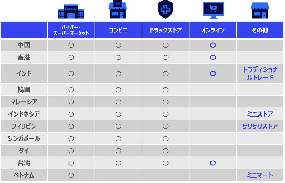 以下の通り、フィリピンのサリサリストアや、インドネシアとベトナムのミニマート、インドにおけるトラディショナルトレードとされるパパママストアのような、データ入手が困難とされるリテールのデータが含まれたレポートとなっており、特に東南アジアをはじめとするアジア・パシフィック地域でのビジネス拡大を検討する日本企業にとって必要とされる情報が網羅されている。