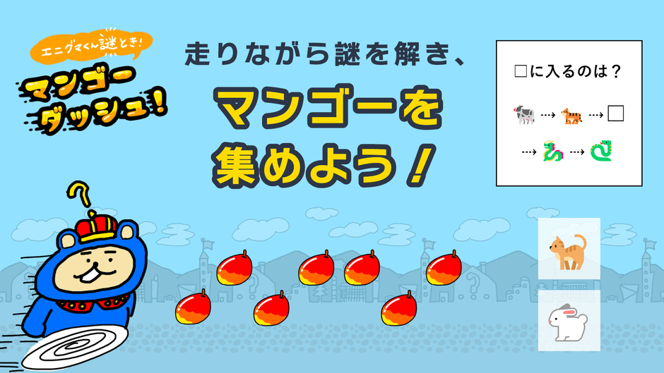 待ち時間にぴったり! 友達とゆるく楽しめる無料アプリゲーム 『エニグマくん謎解き! マンゴーダッシュ』 現在配信中!