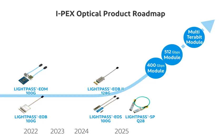 LIGHTPASS(R)シリーズは、シリコンフォトニクスIC「IOCore(R)」を搭載した双方向光通信可能なマルチモードのアクティブ光モジュールです。I-PEXは現在までに「LIGHTPASS(R)-EOB 100G」「LIGHTPASS(R)-EOM 100G」「LIGHTPASS(R)-EOB II 128G」「LIGHTPASS(R)-EOS 100G」の4種類のアクティブ光モジュール製品をラインナップしています。