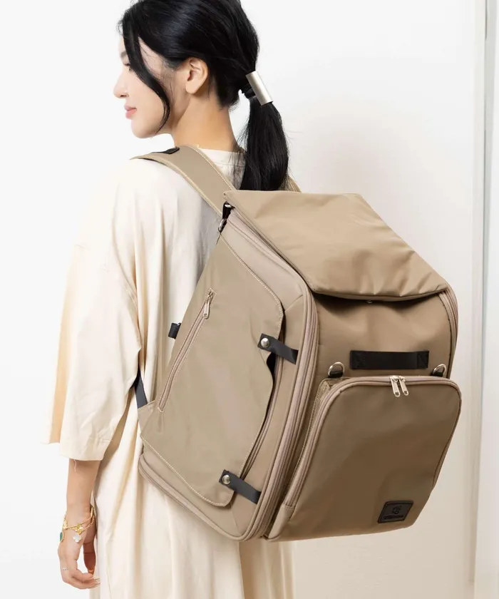 超軽量の本体重量は約1,400gと、快適な移動を実現するために試行錯誤をしました。厚めのショルダーパッドとチェストベルトが付くことで負担を軽減、疲れにくくなるよう工夫しています。リュックからショルダーバッグへ、状況に応じてスタイルチェンジもできて快適です。