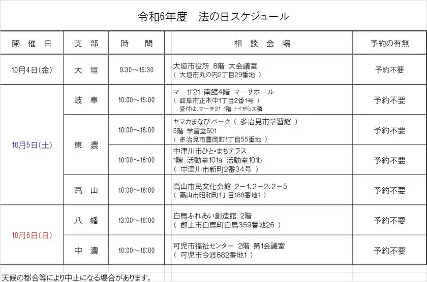 10月1日は「法の日」です。司法書士による無料相談会を 10月4日(金)~6日(日)岐阜県内各地で開催