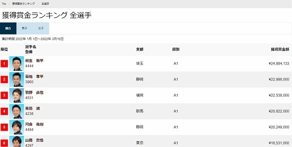 報知新聞社が運営するボートレース専門サイト「ボートナビ報知」(https://boatnavi.hochi.co.jp/)では、「獲得賞金ランキング」ページを新たに追加いたしました。12月13日~18日(大村)のグランプリ(GP)に出場できるのは、1月1日から今年のチャレンジカップ最終日(11月27日・鳴門)までの獲得賞金上位18人までで、グランプリシリーズ出場者は19位~60位まで。さらに12月28日から31日のクイーンズクライマックス(住之江)に出場できるのも女子の獲得賞金上位12名。ボートナビ報知では男女あわせた「総合」はもちろん、男子、女子といずれも上位100選手を掲載しています。