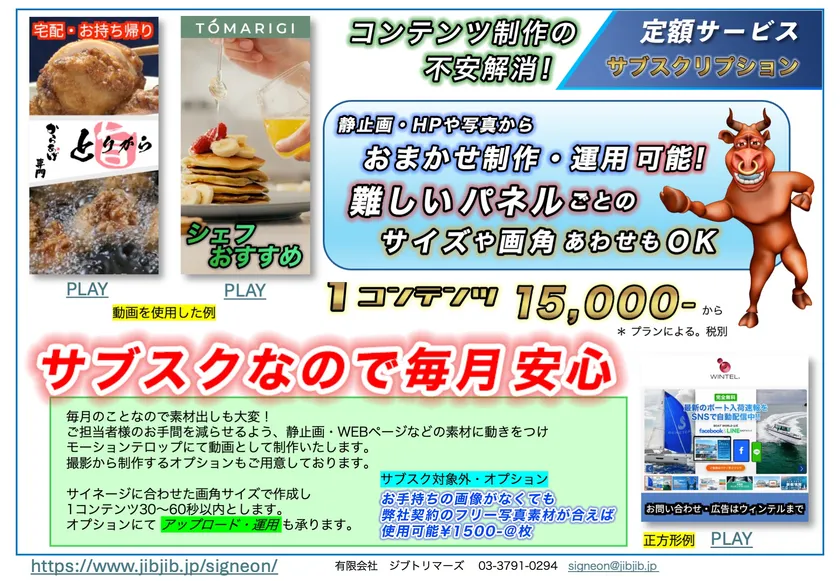 有限会社ジブトリマーズ(東京・品川区)は、2024年9月6日、デジタルサイネージに特化した画期的な「サブスクリプション型動画制作プラン」を発表しました。この新しいプランは、企業がサイネージ導入の際に一番のネックとなっている「コンテンツをどうする?」といった担当者様の不安を解消するものとなります。