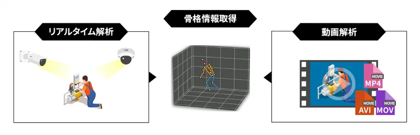 カメラからのリアルタイム映像や、録画された映像をAIが自動解析します。リアルタイムで解析結果が表示されるので、負荷の高い作業を即座に判断することができます。また録画された映像からの解析も可能です。