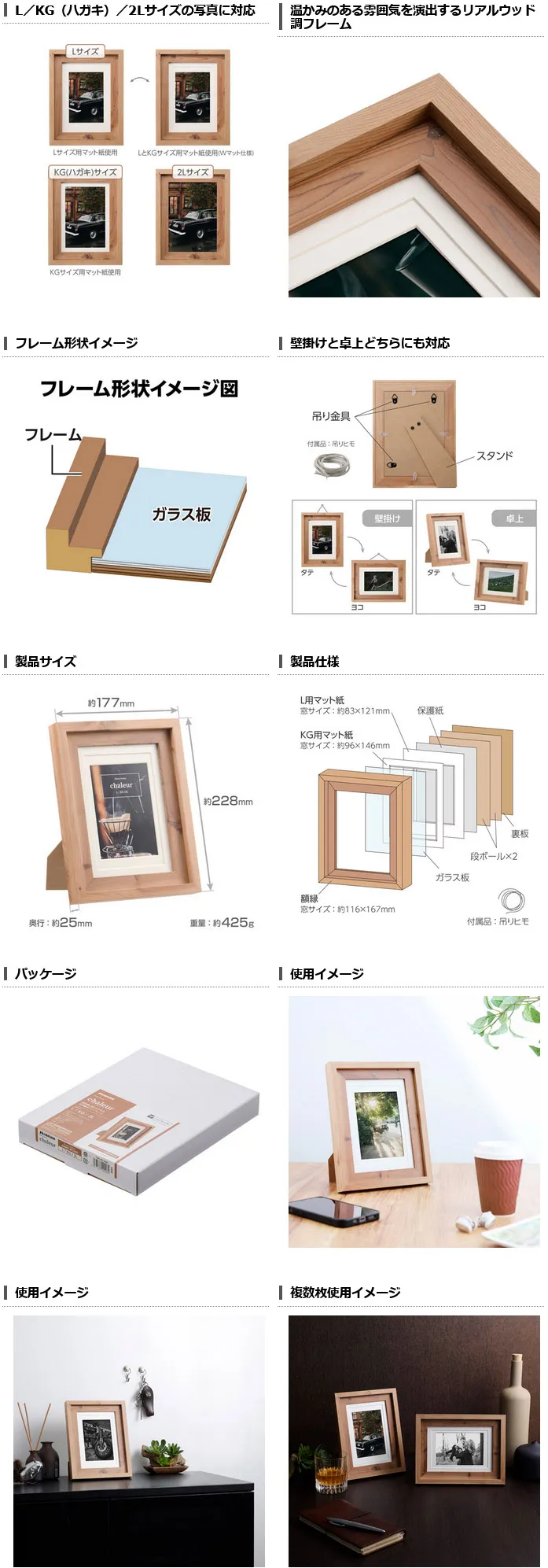 2Lサイズの写真の他に、付属のマット紙(中額)を使うことで、LサイズやKG(ハガキ)サイズの写真も飾れます。Lサイズの写真を飾る場合は、Lサイズ用とKGサイズ用のマット紙を重ねて、さらに立体感が強調されるWマット仕様で飾ることもできます。