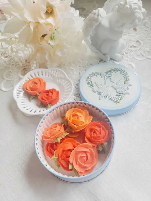 フラワーカップケーキは白あんにバタークリームを加えたコクのあるあんクリームを使用し、花びら1枚1枚を丁寧に絞り出しバラ等の花の形を作るケーキです。1個単位で購入していただけるので手軽に手に取っていただけます。