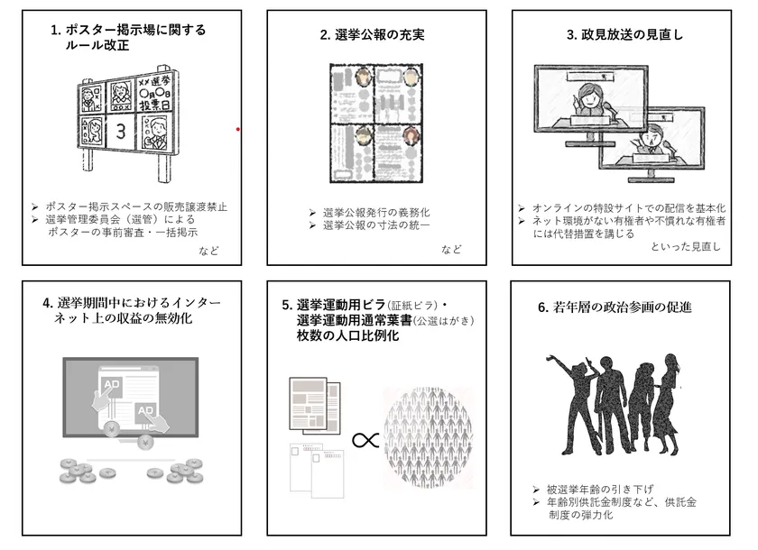 以上の事態を問題視しながらも、従来の選挙公営制度の積極的側面を評価し、制度改革を進めるためには、どのようにすればよいのか。本提言は、あるべき選挙の姿―――(i)開かれている、(ii)公平・公正である、(iii)正当性が担保されている、という3つの理念が実現された選挙―――から、早期的に取り組むべき施策として、以下の6つの提言を行いました。