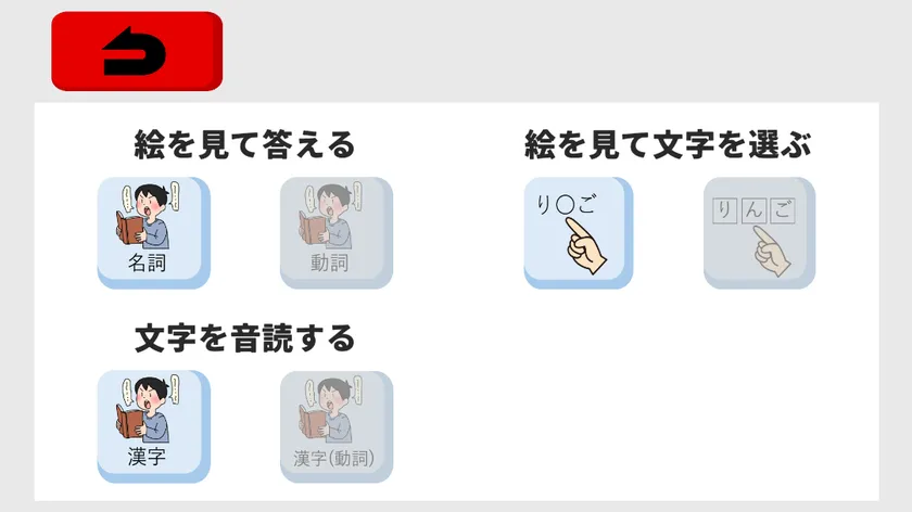 言語機能である「読む」「聞く」「話す」能力に関する基本的なトレーニングを搭載しています。