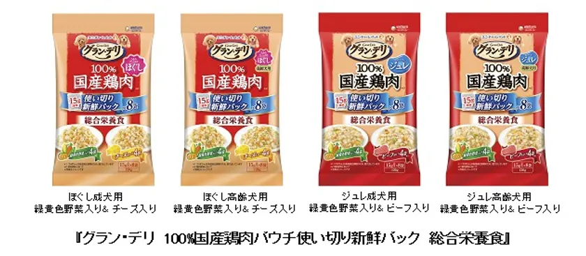 そこでこのたび、食べ切りタイプの少容量と、高まる健康ニーズにお応えして、『グラン・デリ 100%国産鶏肉パウチ使い切り新鮮パック 総合栄養食』を発売します。