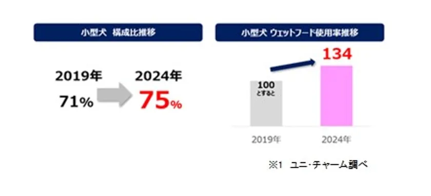 近年、室内で飼うことができる小型犬の人気が高まっています。小型犬は噛む力が弱いため、ペットフードには食べさせやすいウェットタイプを選ぶ飼い主様が増えています。当社の調査によると、ウェットタイプの使用率は2019年を100とした場合、2024年には134まで拡大していることがわかりました。※1
