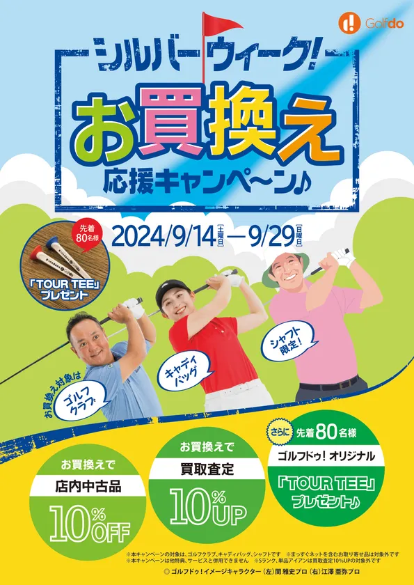 中古ゴルフクラブの買取・販売事業を手掛ける株式会社ゴルフ・ドゥ(本社:埼玉県さいたま市中央区 代表取締役社長:佐久間 功)は、関東1都5県、兵庫県、九州4県にある「ゴルフドゥ!」24店舗において、秋のゴルフシーズンの幕開けを告げるシルバーウィークにあわせて「シルバーウィーク!お買換え応援キャンペーン」を、2024年9月14日(土)~9月29日(日)に開催いたします。ご自宅などで眠っているゴルフクラブがありましたら、お買換えのお得なこの期間がご活用のチャンスです。また、1店舗につきお買換え先着80名様に、ゴルフドゥ!オリジナル「TOUR TEE」をプレゼントいたします。