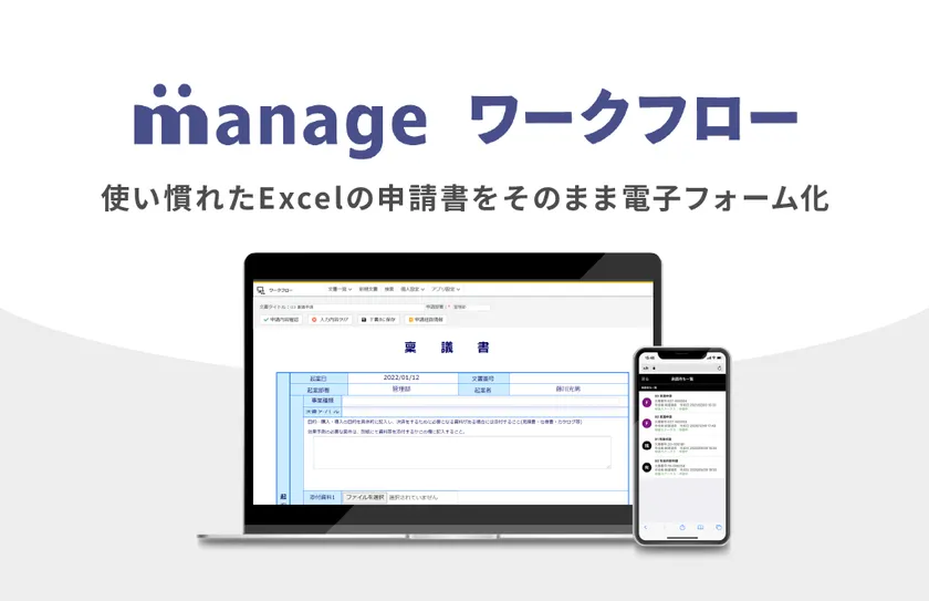 manage ワークフローは、社内の申請書の作成から承認のDX化を支援するツールです。Excelで作成されたイメージをそのままWebフォーム化できるため、簡単に申請書をペーパーレス化可能です。