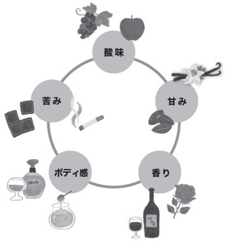 コーヒーの味わいを言葉で表現する時、よく使われるのは、「甘み」「酸味」「苦み」「ボディ感」「香り」の5つです。