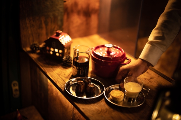 ラウンジ内にはビバレッジカーも導入し、これまでよりもご提供できるメニューが充実。ディナー前のアペリティフとして人気のソムリエ特製ホットワインやサングリアに加え、シェフ特製の温かなスープやキッシュ、カヌレが新たに登場しました。お子様にも喜ばれるホットココアやマシュマロもご用意し、すべてのメニューを無料でご提供しています。また、スターシェード(テント)内には温かなストーブも備え、冬の焚き火を楽しむ環境を整えました。