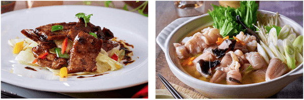 左:麦類といも類の自然由来の餌で育てられる那須高原豚。きめ細かい肉質と、白色の良質な脂身の豚肉を回鍋肉でお楽しみください。