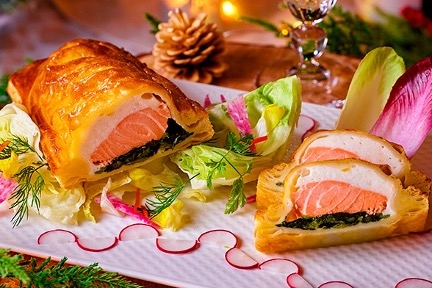 上:天然素材にこだわった餌で育てられたオーガニックサーモンは川魚特有の臭みを感じさせず、しっとりとした身質が魅力です。パイ包みの切り口からサーモンのオレンジとほうれん草のグリーンが覗く、ご馳走メニュー。