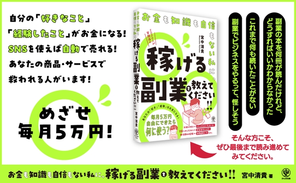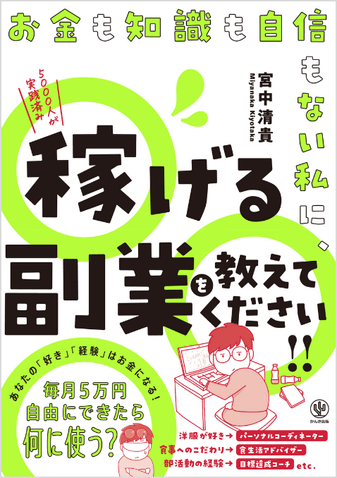 株式会社かんき出版(本社:千代田区 代表取締役社長:齊藤龍男)は、『お金も知識も自信もない私に、稼げる副業を教えてください!!』(宮中 清貴/著)https://kanki-pub.co.jp/pub/book/details/9784761276805を2023年7月5日より全国の書店・オンライン書店等(一部除く)で発売いたします。