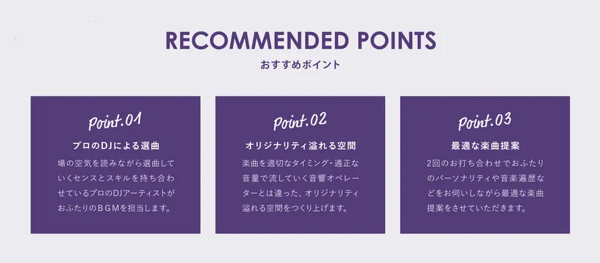 オリジナルのBGMカウンセリングシートで、思い出の曲、季節を感じる曲、お相手から教えて貰った曲、一緒にライブに行くアーティストなど、おふたりのパーソナルな部分を深く掘り下げていきます。