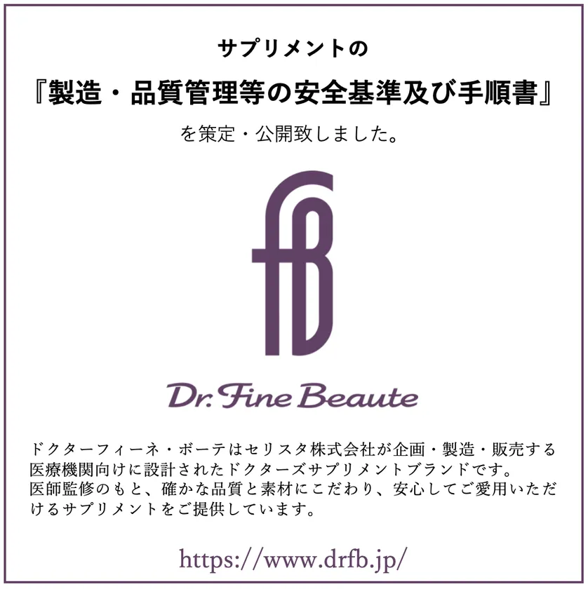 セリスタ株式会社(東京都千代田区、代表取締役:伊藤 承正)は、医療機関専用に企画・開発・販売しているサプリメントブランド『Dr. Fine Beaute/ドクターフィーネボーテ』の製造・品質管理等の安全性基準及び手順書を策定・公開しました。