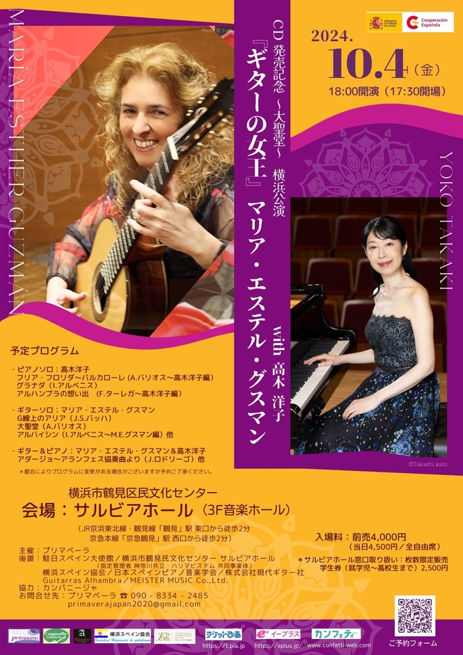 彼女はいつも新しい曲を取り上げるが、テデスコの〈プラテロと私から〉の演奏は実に楽しみである。また、オーケストラとの共演で絶対的な実力を示しているマリア・エステル・グスマンは、〈アランフェス協奏曲〉の〈アダージョ〉をピアノの高木洋子と共演するが、長年コンビを組んでいる彼女たちの演奏にも期待がかかる。円熟期にあるマリア・エステルの素晴らしい演奏に、ぜひ多くの方に接してもらいたい。