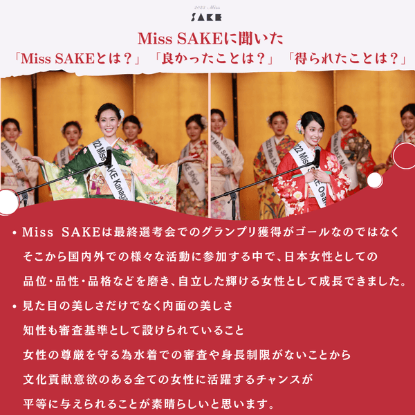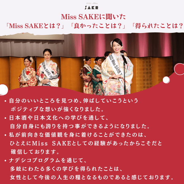 また、Miss SAKEに「Miss SAKEとは?」「良かったことは?」「得られたことは?」聞いた答えをお伝えいたします。