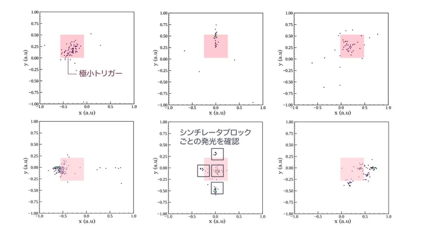 CERNでは、宇宙から降り注ぐ宇宙線を模擬して人工的に光の速さの99%以上の高エネルギーミュオンビームを生成が可能なため、そのミュオンビームを自作した検出器に照射し、2次元方向のイメージング性能を検証しました(図4)。