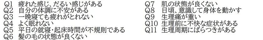 疲労、体調、睡眠、肌・髪の毛の状態、生理の状態など以下の11項目で、豆乳摂取前と豆乳摂取後にアンケート調査を行いました。