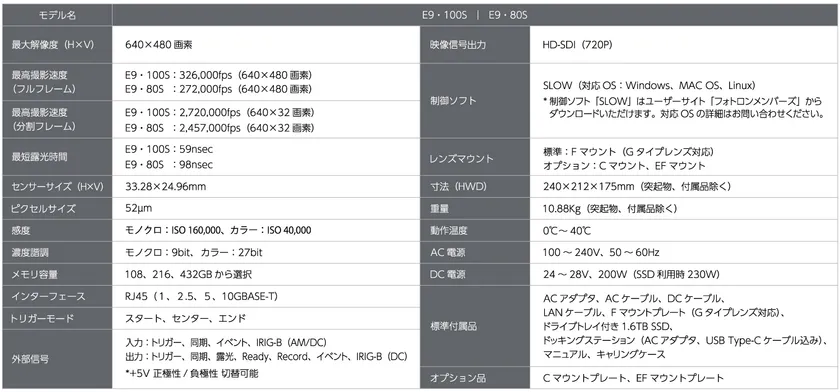 上位モデルの『E9・100S』はフル解像度(640×480画素)で最高326,000 fps、分割解像度(640×32画素)で最高2,720,000 fpsの撮影速度性能を発揮します。『E9・80S』はフル解像度(640×480画素)で最高272,000 fps、分割解像度(640×32画素)で最高2,457,000 fpsの撮影が可能です。