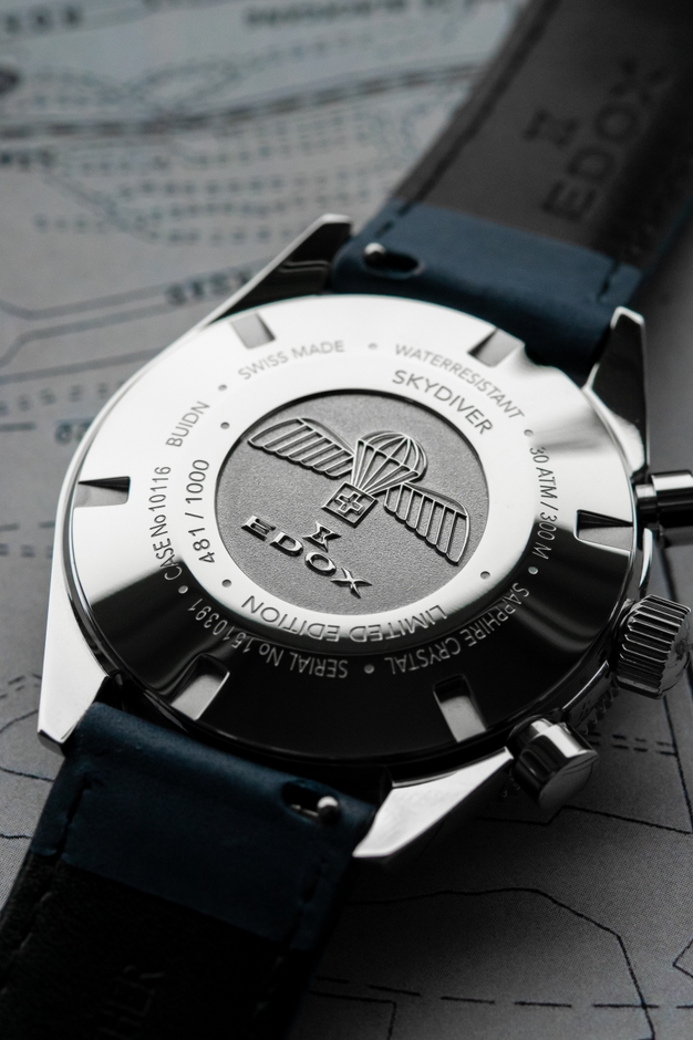 厚みのある高硬度サファイアクリスタルを、美しい曲線を描くドーム型に加工し、当時さながらのレトロな表情に。現代版のアレンジとして、ねじ込み式の裏蓋にパラシュート部隊のモチーフとエドックスのロゴを刻印。