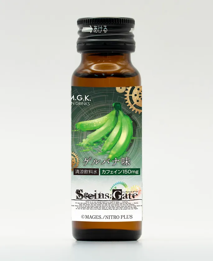 作中で主人公たちの「電話レンジ(仮)」の実験により緑色にゲル化してしまったバナナ「ゲルバナ」と、MGK NN DRINKSのカフェインドリンクと奇跡のマリアージュを果たしました!あまり美味しくないとされる「ゲルバナ」が、もしこの世に実在したら…?美味しかったら…?当社パティシエが作品とゲルバナのイメージをもとに、何度も試作を繰り返して開発しました。