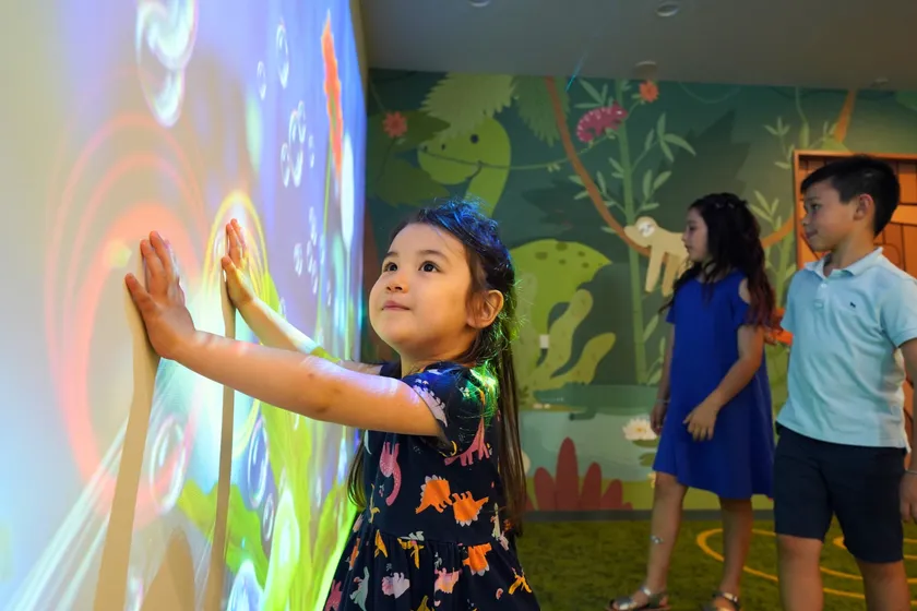 お部屋の外でも子どもたちと一緒に楽しめる空間をご用意しました。エントランスに一歩足を踏み入れると壁一面に広がるプロジェクションゲームが色鮮やかな映像でお客様をお出迎えします。壁に映し出されたふわふわと浮かんでいるシャボン玉にタッチ。すると、シャボン玉がパチンと割れて、キノコの妖精と植物の種が地面に落ちていきます。キノコの妖精が地面に種を植えると、お花が次々と咲いていきます。「ほら、ここをタッチしてみて!」「すごい!お花が咲いたね」と、親子の会話が自然と生まれそう。家族みんなで楽しくコミュニケーションを取ることができる空間です。