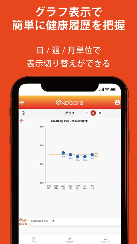 日々の体温・体調を入力し登録を行っていただくと、1日や1週間、1か月単位のグラフで体温の変化を確認することができます。また、部署や店舗などでグループの登録を行うことで、グループに参加された方の健康状態が一覧で把握でき、手間なくグループ参加者の体調管理を行うことが可能です。