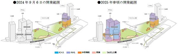 「グラングリーン大阪」は、オフィス、ホテル、中核機能施設、商業施設、都市公園、住宅を有する複合施設です。先行まちびらきでは、うめきた公園の一部(サウスパークの全面・ノースパークの一部)、北館のホテル「キャノピーbyヒルトン大阪梅田」※3、商業施設「SHOPS & RESTAURANTS」、中核機能施設「JAM BASE」がオープンしました。南館は2025年春頃、うめきた公園後行工区(ノースパークの一部)は2027年春頃に開業予定です。