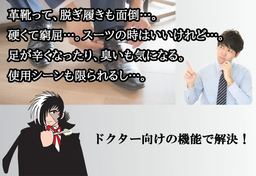 本シューズは、45年前にドクター向けに開発されたシューズの当時のラスト(木型)を採用し製造いたします。木型、シルエット、製造工場はそのままに新たな機能を付加し、<ブラック・ジャック>メディカルシューズとして令和に蘇ります。