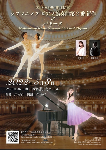 Kei Star Ballet第1回公演『Rachmaninov Piano Concerto No.2&Paquita』が2022年5月8日(日)にハーモニーホール座間 大ホール(神奈川県座間市)にて上演されます。チケットはカンフェティ(運営:ロングランプランニング株式会社、東京都新宿区、代表取締役:榑松 大剛)にて2月7日(月)10:00より発売開始です。