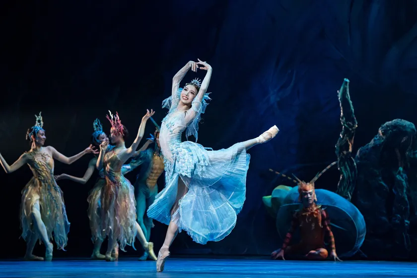 白眉はやはり、海中の場面だ。気のいいロブスターや俊敏なカクレクマノミに囲まれたマーメイド・飯島望未の無邪気な愛らしさは比類がない。かき分けるような手足の使い方や流線を描くリフトから、海水の質量が確かに感じられる。ウロコの一枚一枚にまで意匠を凝らした装いは、全身に光をまとうかのよう。衣裳家アンゲリーナ・アトラギッチの才気に舌を巻いた。