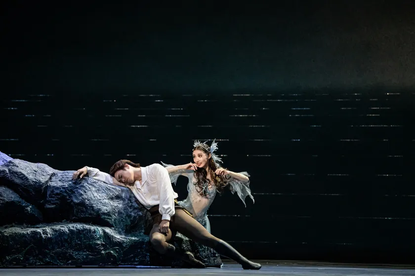 第二幕。陸上でマーメイドを待ち受けるのは、制服や式服をまとった人間たちだ。プリンスと隣国のプリンセスの婚約式は、古典バレエさながらのグラン・パ・ド・ドゥ形式で描かれる。完璧な身ごなしで社交界の頂点たる輝きを放つプリンセス。これほど弛緩のないバリエーションも珍しいが、日高世菜が驚異的なバランスと回転で圧倒した。一方のプリンスは、おぼれる自分を救ってくれた恩人の面影を記憶の底に刻みながらも、突然浜辺に現れた娘の正体に気付くことはない。優しさと誠実さ、それゆえの残酷さを、山本雅也が余すところなく表現した。
