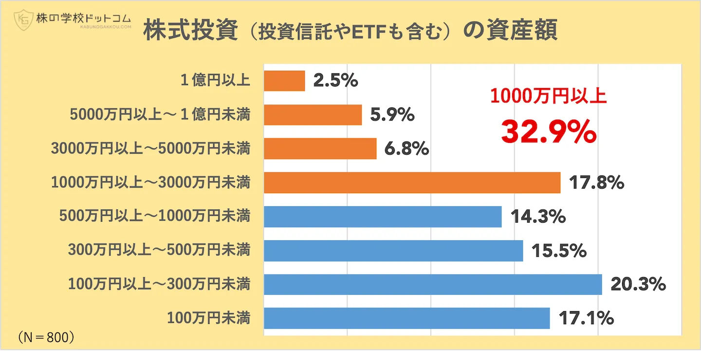 投資信託やETFも含めた株式投資の資産額について質問したところ、「100万円以上~300万円未満」と回答した人が最も多く、20.3%でした。次に多かったのは、「1000万円以上~3000万円未満」の17.8%、その次が「300万円以上~500万円未満」の15.5%でした。1000万円以上の人は合計で32.9%でした。