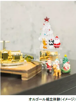 オルゴール職人のサポートのもと、自分だけの音色のオルゴール作りが体験できます。お好みの曲、ケース、コース(一般コース、上級コース)を選んで、完成したオルゴールは持ち帰りできます。心を込めて作ったオルゴールは、クリスマスプレゼントにもぴったりです。クリスマスらしい飾り付け小物(220円~)もご用意しています。