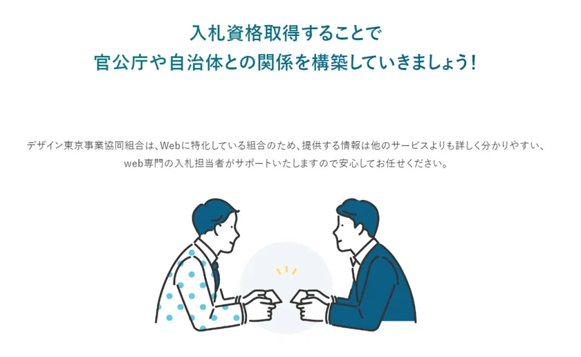 中小企業を対象に官公庁や地方自治体との取引機会を拡大するWEB専門の入札組合であるデザイン東京事業協同組合は、入札案件情報の提供と入札参加資格取得サポート支援を2024年9月より開始いたしました。他にはない現役のWEB専門入札プロの組合が支援いたします。