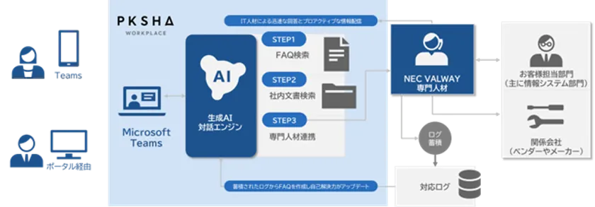 新ソリューションは、長年にわたりサポートデスクサービスをお客様に提供してきた中で蓄積されたNEC VALWAYのノウハウとデータ、そしてPKSHA社が開発した独自の生成AI、及び「Microsoft Teams」を活用したソリューション「PKSHA AI ヘルプデスク」を組み合わせることで、さらなるヘルプデスク業務の刷新に繋げられると考え、リリースに至りました。